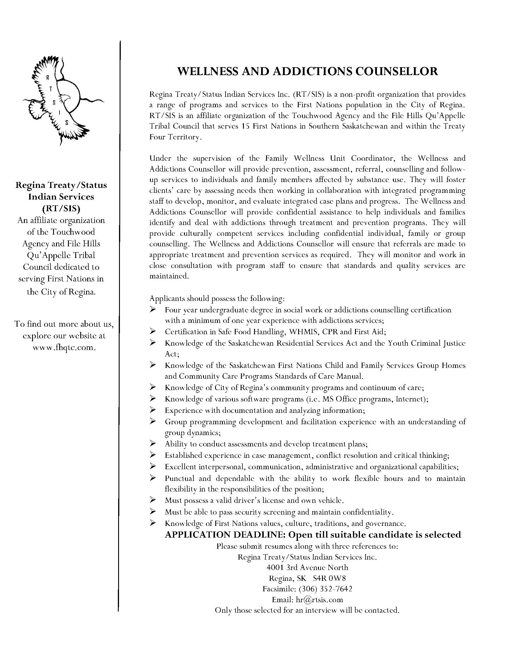 Under the supervision of the Family Wellness Unit Coordinator, the Wellness and Addictions Counsellor provides prevention, assessment, referral, counselling, and follow-up services to individuals and family members affected by substance use. The incumbent will foster client care by assessing needs and collaborating with integrated programming staff to develop and evaluate case plans.